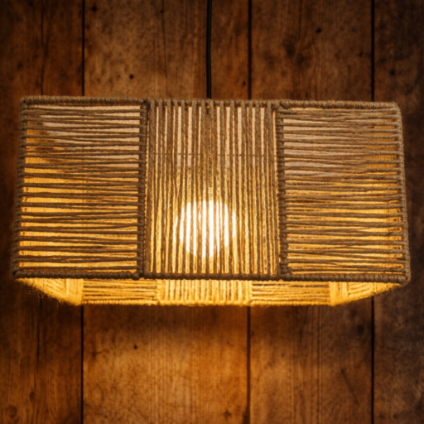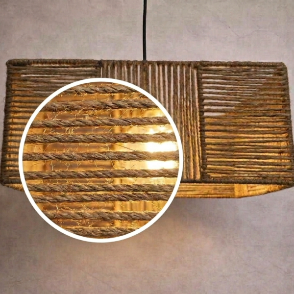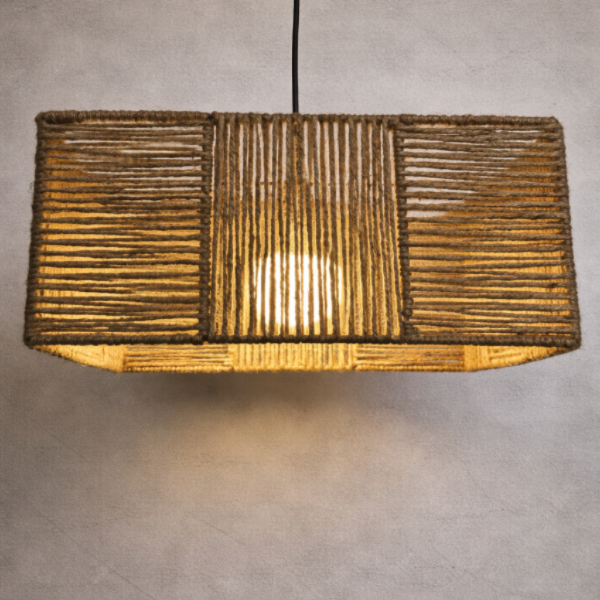 Lámpara colgante hilada a mano con fibras naturales, diseñada para crear una iluminación cálida y envolvente. Su trama lineal genera un juego de luces y sombras que aporta textura y profundidad al ambiente.