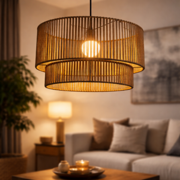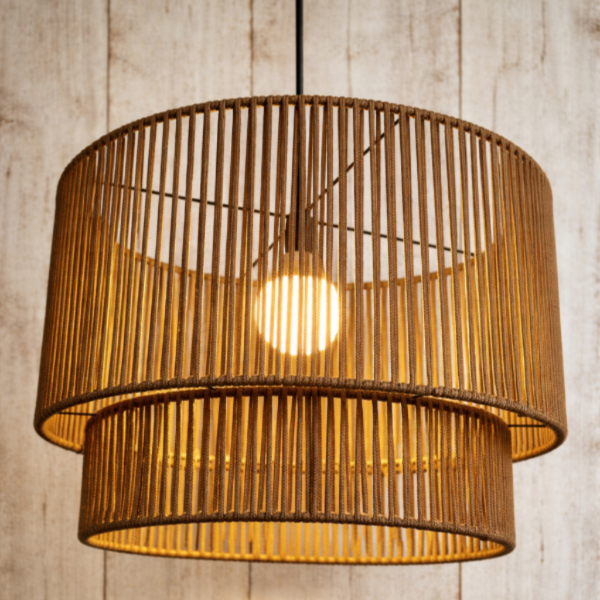 Lámpara colgante de diseño contemporáneo, realizada artesanalmente con cordón de polipropileno. Su estructura de doble nivel genera un volumen elegante y liviano, creando un efecto visual sofisticado y una iluminación cálida envolvente.